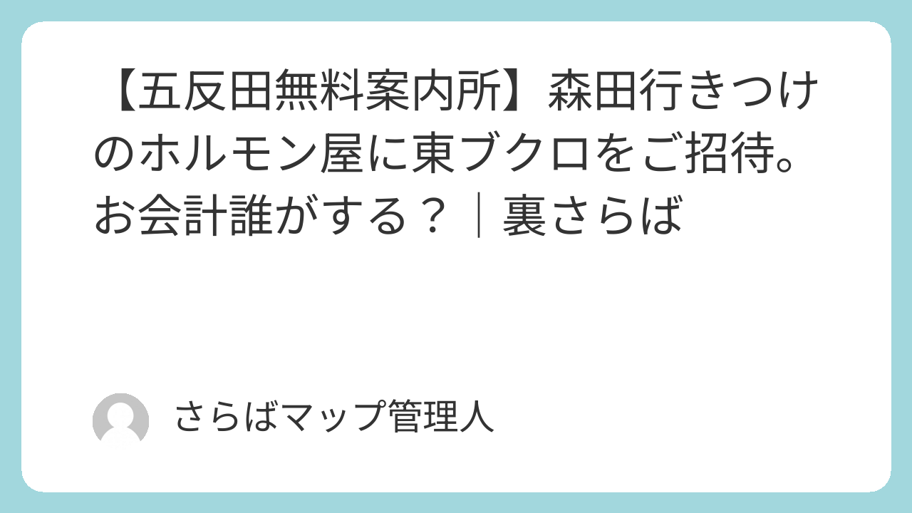 本記事では、さらば青春の光のYouTubeサブチャンネル「裏さらば」の動画「【五反田無料案内所】森田行きつけのホルモン屋に東ブクロをご招待。お会計誰がする?」で訪れたロケ地・撮影場所・訪問スポットをまとめています。