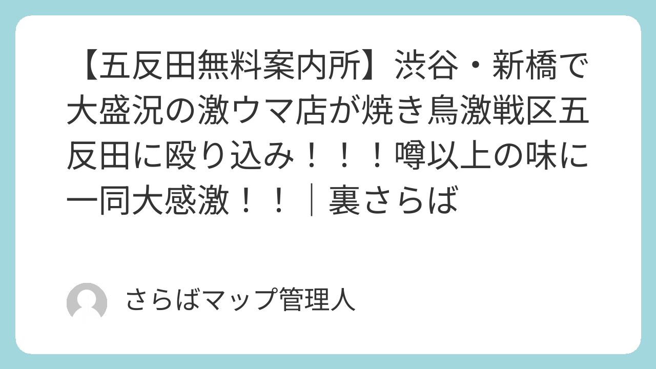 本記事では、さらば青春の光のYouTubeサブチャンネル「裏さらば」の動画「【五反田無料案内所】渋谷・新橋で大盛況の激ウマ店が焼き鳥激戦区五反田に殴り込み!!!噂以上の味に一同大感激!!」で訪れたロケ地・撮影場所・訪問スポットをまとめています。